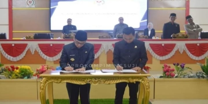 Mesuji-DPRD Kabupaten Mesuji mengesahkan Anggaran Pendapatan dan Belanja Daerah (APBD) Mesuji Tahun Anggaran 2025 melaui Rapat Paripurna Pembicaraan Tingkat II dalam rangka Penandatanganan Persetujuan Bersama Nota Kesepakatan dan Rancangan Peraturan Daerah tentang APBD 2025.
