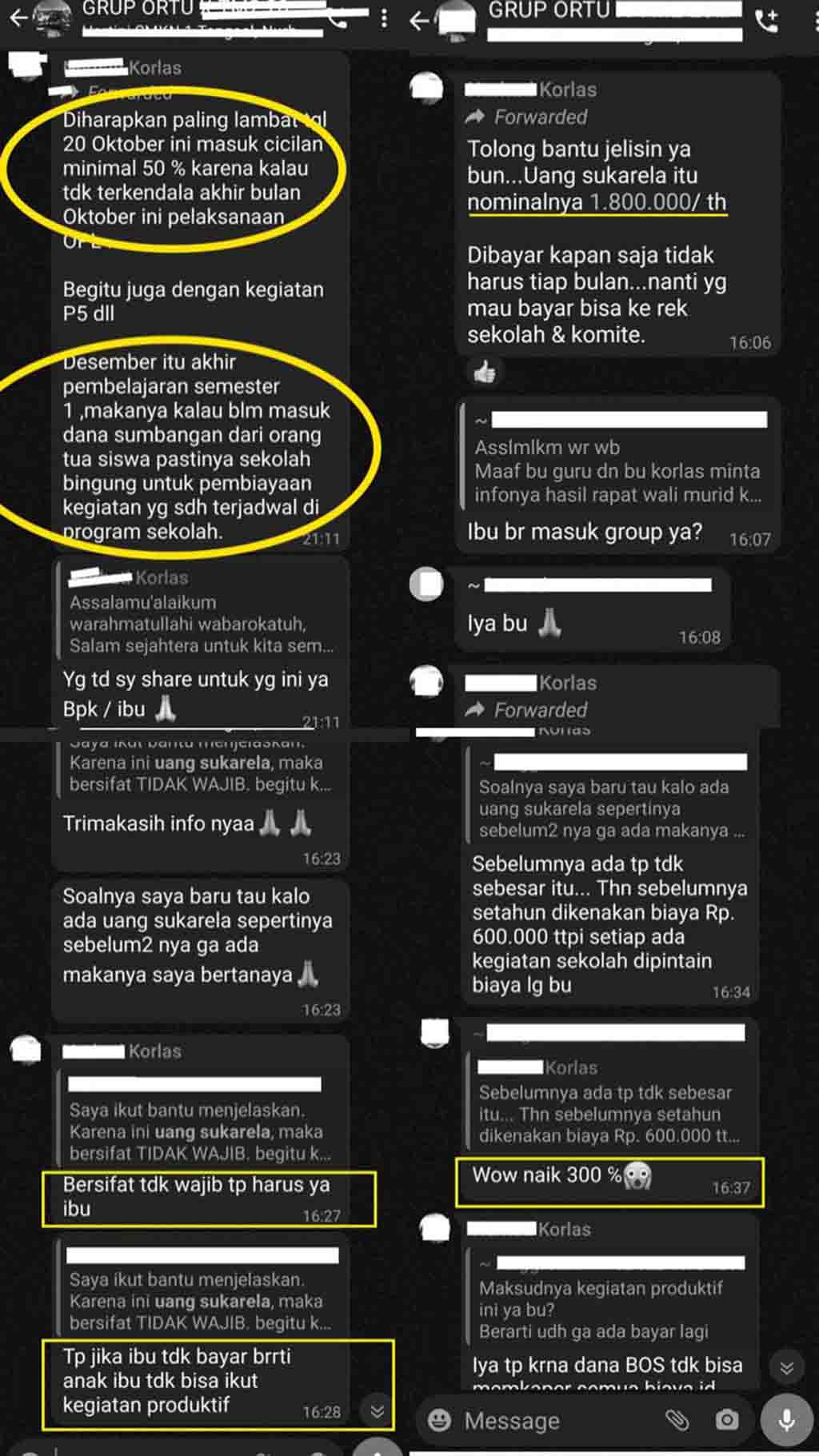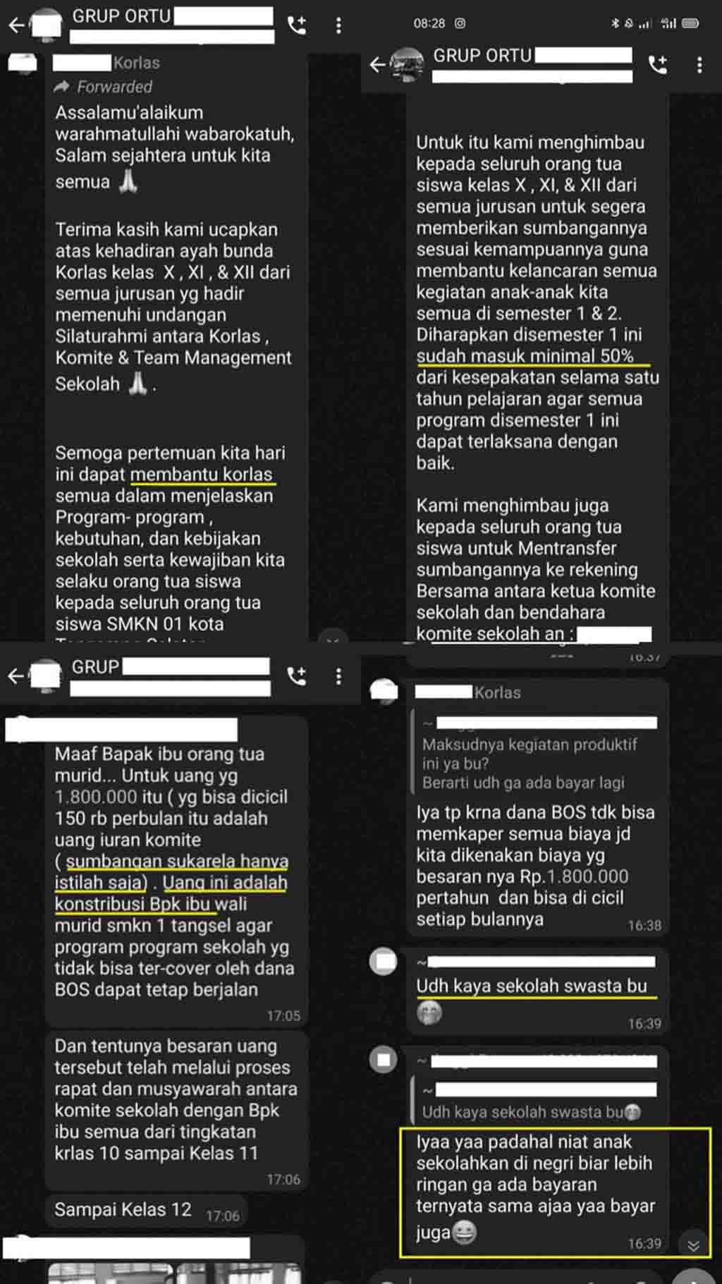 Dalam percakapan di grup WhatsApp itu, ada orang tua yang menyindir kalau besaran sumbangan layaknya terjadi di sekolah swasta. Ubaid juga memperlihatkan bukti kwitansi sudah ada orang tua yang membayar sumbangan tersebut.
